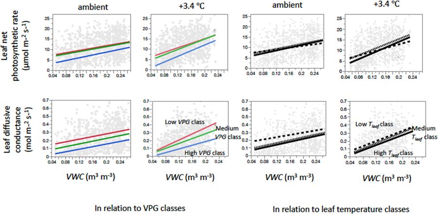 气候变暖会通过热效应以及改变土壤湿度影响光合作用。这两种效应对全球森林广大区域来说都可能很重要。研究展示了随着生长季节从雨季过渡到适度干旱期,气候变暖对南北方树种从积极到消极的影响。在对11种温带和北方幼林的进行为期3年的露天增温实验中,当气温升高3.4℃时,最湿润土壤中的光饱和净光合作用和叶片扩散电导平均在1/3的时间里增加了。而在干旱期,所有11种植物的叶片扩散电导以及光饱和净光合作用均下降了,而且温度升高的植物中的相关下降幅度比在常温下的植物大得多。因此,在干旱土壤中,温度升高在2/3的时间里减少了光饱和净光合作用。由此可见,低土壤湿度可能会降低,甚至逆转气候变暖在湿度适中、季节性寒冷环境下光合作用的潜在益处,而且在生长季节期间的干旱期和经常发生湿度干旱期均会如此。