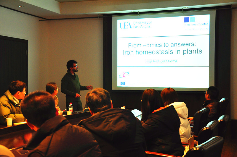 2019年1月10日上午,Jorge Rodriguez Celma博士做了题为“From -omics to answers: Iron homeostasis in plants”的学术报告,总结了根系次生代谢产物在铁高效吸收利用方面的作用、原理、机制及其应用前景,并结合自身研究就这些研究成果是如何一步一步从现象观察到机制阐释进行了系统介绍。此外,Jorge Rodriguez Celma博士还介绍了最新研究进展,从生理、生化、遗传和分子等角度对植物如何感知缺铁、调控铁吸收相关基因的表达、维持胞内铁稳态等方面进行了深入浅出的介绍。Jorge Rodriguez Celma博士的报告对提升学生的科研水平、特别是从多角度思考科学问题提供了参考和启发,同时Jorge Rodriguez Celma博士来访对加强相关领域的国内外合作奠定了良好的基础。