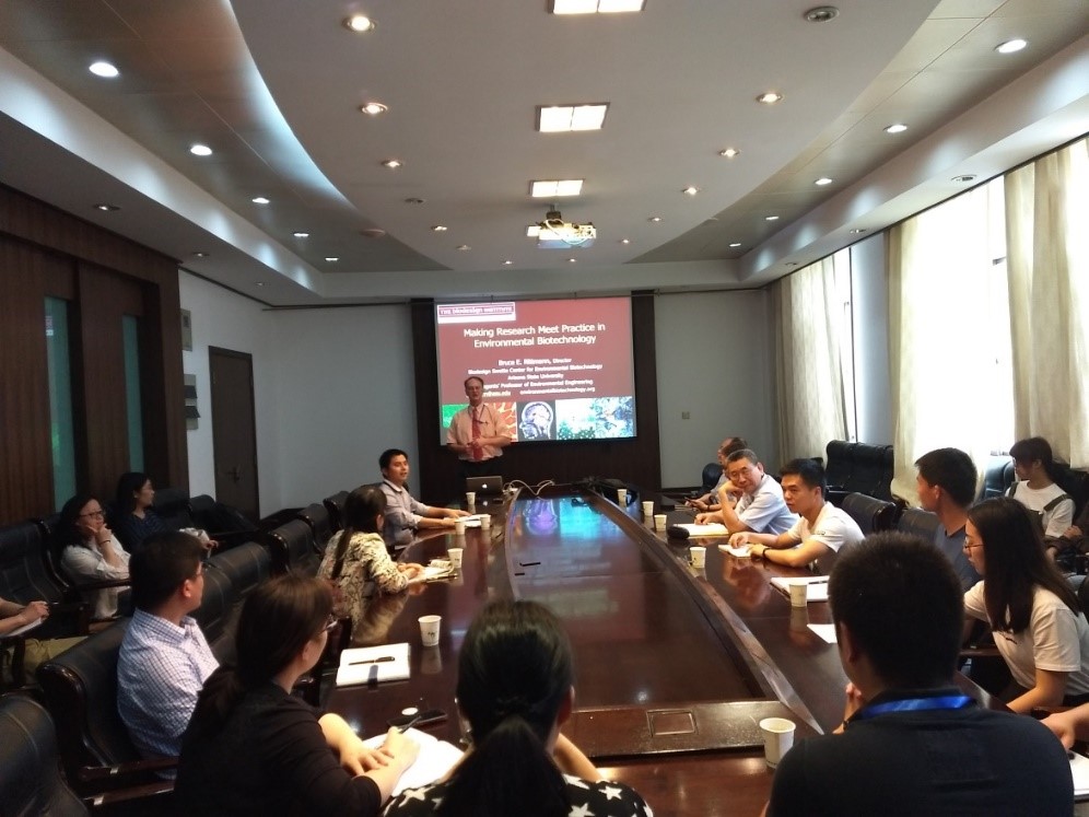 报告中,Bruce深入浅出地介绍了环境生物技术以及微生物生态学的研究内容:存在什么微生物,微生物可以做什么,微生物正在做什么,微生物之间的相互作用;并结合自己工作中的实例介绍了研究微生物生态的重要“工具”;其次提出了几个有前景的研究方向;最后介绍了美国亚利桑那州立大学Swette生物设计研究所(Swette Biodesign Institute)的概况以及研究团队。报告结束后,与会人员就感兴趣的问题与Bruce教授进行了深入的探讨。