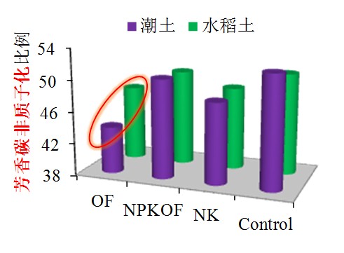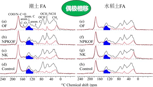 为此,我室赵炳梓课题组利用封丘长期试验地平台借助高级核磁共振技术研究了23年长期平衡施肥和缺磷条件下富里酸的结构分异,并以土壤有机质含量较高的桃源水稻土作为对照。结果表明潮土平衡施肥相比缺磷处理均增加了富里酸的分解程度和芳香度,暗示平衡施肥下富里酸的腐殖化程度更加明显;而水稻土富里酸的结构则差异较小,说明两种截然不同的气候环境和土壤中,富里酸结构对施肥的响应也有所区别。利用偶极相移技术研究还发现两种土壤富里酸中的芳香碳非质子化比例达到44-52%,施肥尤其是有机肥降低了该比例。非质子化的芳香碳相对难以被降解,从这个角度看富里酸并没有预期的高活性。研究结果为富里酸结构提供了新的认识,并为提高土壤肥力提供了一定的理论依据。
