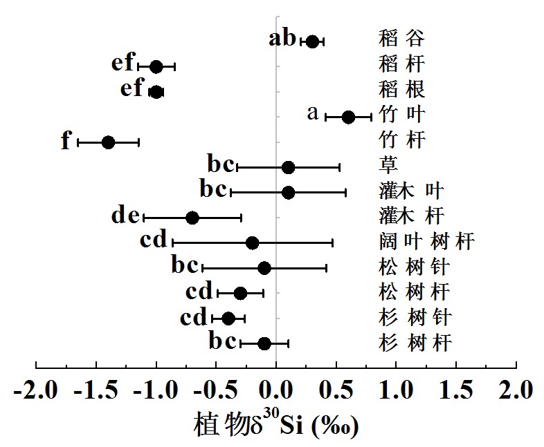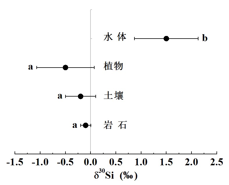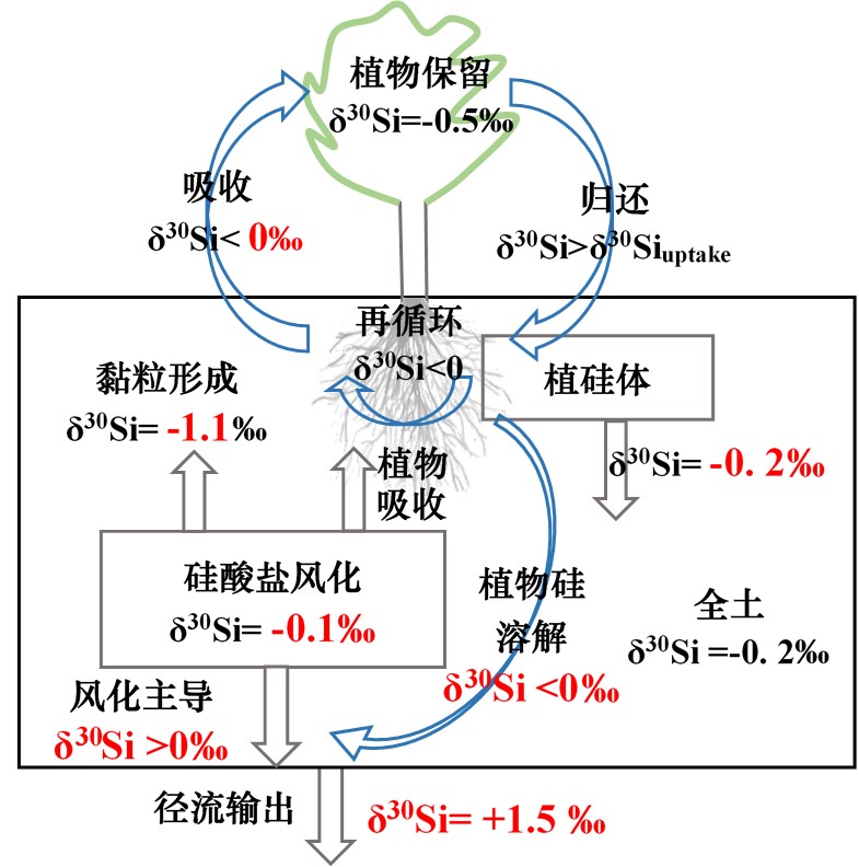 通过流域内岩石、土壤、植物和水体的硅同位素值比较,结合硅在自然界中动力学分馏的原理,进一步明确了该地区岩石、土壤、植物和水体内硅同位素的分馏过程(图4),发现径流水中的硅主要来自原生矿物风化过程,受植硅循环过程的影响较小,这一研究结果与利用流域内硅循环通量计算结果相一致。因此,水体的硅同位素值能够指示硅的来源。图4:典型花岗岩发育土壤体系中的硅循环和同位素分馏过程