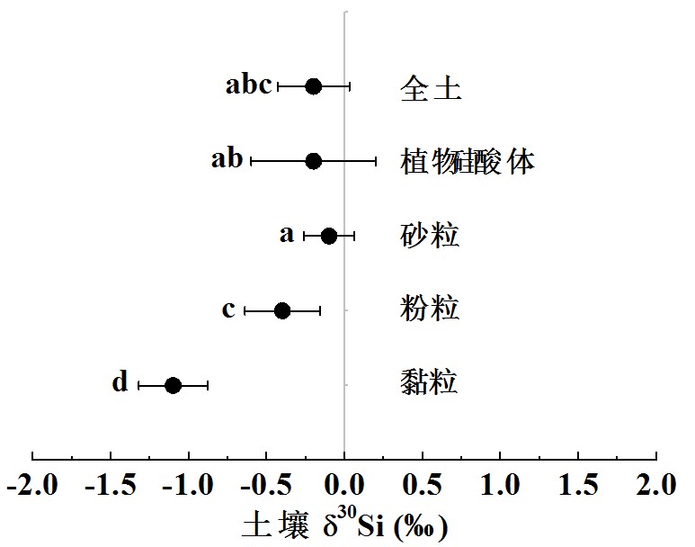 本室杨金玲研究员在皖南花岗岩小流域内系统地观测了岩石、土壤、植物和水体的硅同位素值。发现流域体系中岩石、土壤、植物、水体之间存在着明显的硅同位素分馏,径流水中的硅偏重,植物和土壤中的硅偏轻,这与前人的研究结果相一致(图1,图2)。而不同土壤组分之间硅同位素分馏也十分明显,土壤黏粒明显富集轻硅,而且随着土壤的发育,硅同位素的分馏一直在进行。因此,土壤硅同位素值与土壤的发生演变密切相关(图3)。