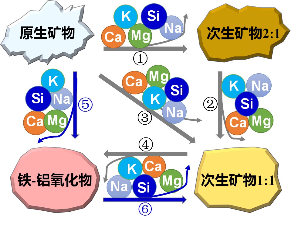 水体明显富集重硅同位素(δ30Si值为+1.5 ‰),这样土壤脱硅过程会不断降低土壤的δ30Si值。但由于植物优先从土壤中吸收轻硅,其在植物体内进一步分馏(图2),导致以落叶归还土壤的植物硅酸体硅可以减缓土壤硅同位素值的进一步下降。 黏粒显著富集轻硅同位素(δ30Si值为-1.1 ‰),证实了一个重要成土过程的存在——次生黏土矿物的再合成过程。一般认为,土壤中的黏土矿物主要有3个形成途径:岩屑物理风化、化学风化和再合成。化学风化是矿物逐渐脱盐基和脱硅,这个过程硅同位素不分馏(图5①, ②, ③, ④);岩屑物理破碎过程硅亦不产生分馏。因此,黏粒富集轻硅同位素证实了土壤黏粒的再生机制(图5⑥),而且这个过程很可能是亚热带地区次生黏土矿物形成的主要机制。图5:黏粒硅同位素偏轻指示了矿物风化和次生黏土矿物的形成过程