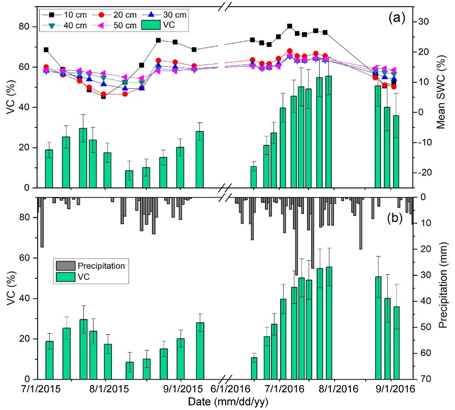 植被盖度在2015和2016生长季的时间分布及对降雨和土壤含水量的响应特征