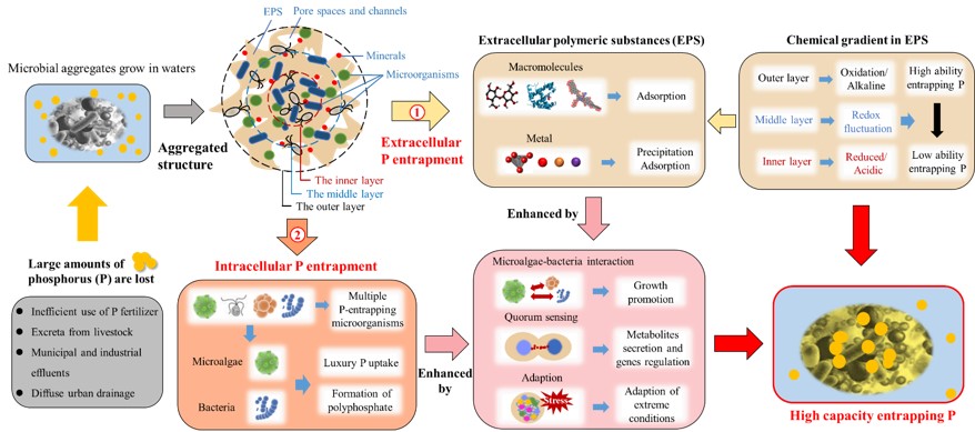 相对纯菌株而言,微生物聚集体具有更高抵抗力、恢复力和功能冗余性,表面黏附多种矿质,还能产生多种形态的胞外聚合物,这些群落特征和表面属性在抵抗环境胁迫和提高磷的捕获能力等方面展现了巨大的优势和潜力。在受Cell Press旗下期刊Trends in Biotechnology邀请撰写关于微生物聚集体抵抗纳米颗粒毒性综述文章(https://doi.org/10.1016/j.tibtech.2018.06.009)之后,近日,我室吴永红团队再次受邀发表了题为“Using Microbial Aggregates to Entrap Aqueous Phosphorus”的综述。
