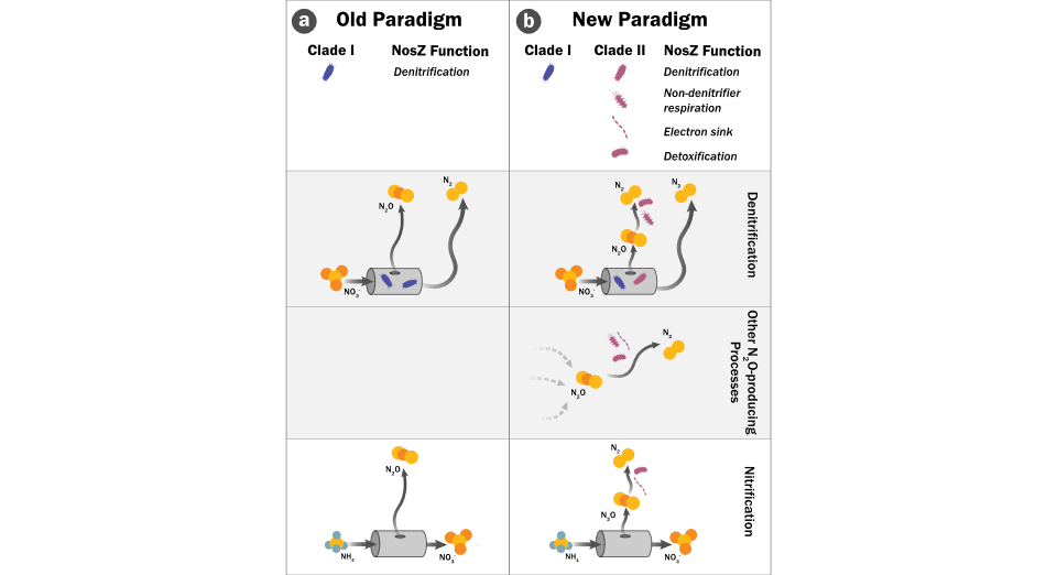 2) 针对旱地系统,通过将RoFlow与15N-N2O site preference (SP)技术联用,揭示了集约化种植体系下果园和蔬菜地等旱地系统中碳源和硝酸根含量对反硝化速率和产物比的调节机制。发现秸秆添加可显著促进土壤N2O排放和反硝化速率,但秸秆添加对反硝化的促进作用及其对反硝化产物比[N2O/(N2O+N2)]的影响取决于土壤硝酸根的含量;通过15N-N2O SP分析显示,田间实际含水量(55-80% WFPS)情况下,细菌反硝化和硝化细菌反硝化过程是旱地系统N2O产生的主导途径;在相同土壤氮含量下,秸秆添加能够显著促进N2O的还原(N2O还原为N2)并提高N2排放峰值,与观测到的N2O还原酶(N2OR)功能基因nosZ的丰度变化趋势相一致,暗示秸秆添加可能对N2O还原功能微生物具有显著影响(Wu et al., 2018; Wei et al., 2020)。而目前已知nosZ包括两个不同的分支:较为熟知的Clade Ⅰ型分支,通常为反硝化微生物携带;以及新的Clade Ⅱ型分支,为多种类型微生物携带,其中大多数是非反硝化微生物。通过对2013-2019年间有关NosZ论文的荟萃分析发现,Clade Ⅱ型N2O还原微生物在影响N2O排放方面具有之前未认识到的重要作用,如其可以消耗非反硝化过程产生的N2O、以N2O为“电子汇”清除多余电子及解除N2O细胞毒害,同时Clade Ⅱ 型N2O还原微生物还具有不同于Clade Ⅰ 型N2O还原微生物的酶促动力学特征,且在许多生态系统的土壤中,Clade Ⅱ型N2O还原微生物的数量占据优势地位。基于上述认识,提出了N2O还原过程中Clade I 和Clade II类型微生物作用的范式图(图1),未来研究须重点关注Clade Ⅱ型N2O还原微生物在调节土壤N2O排放中作用(Shan et al., Glob. Change Biol. 2021)。