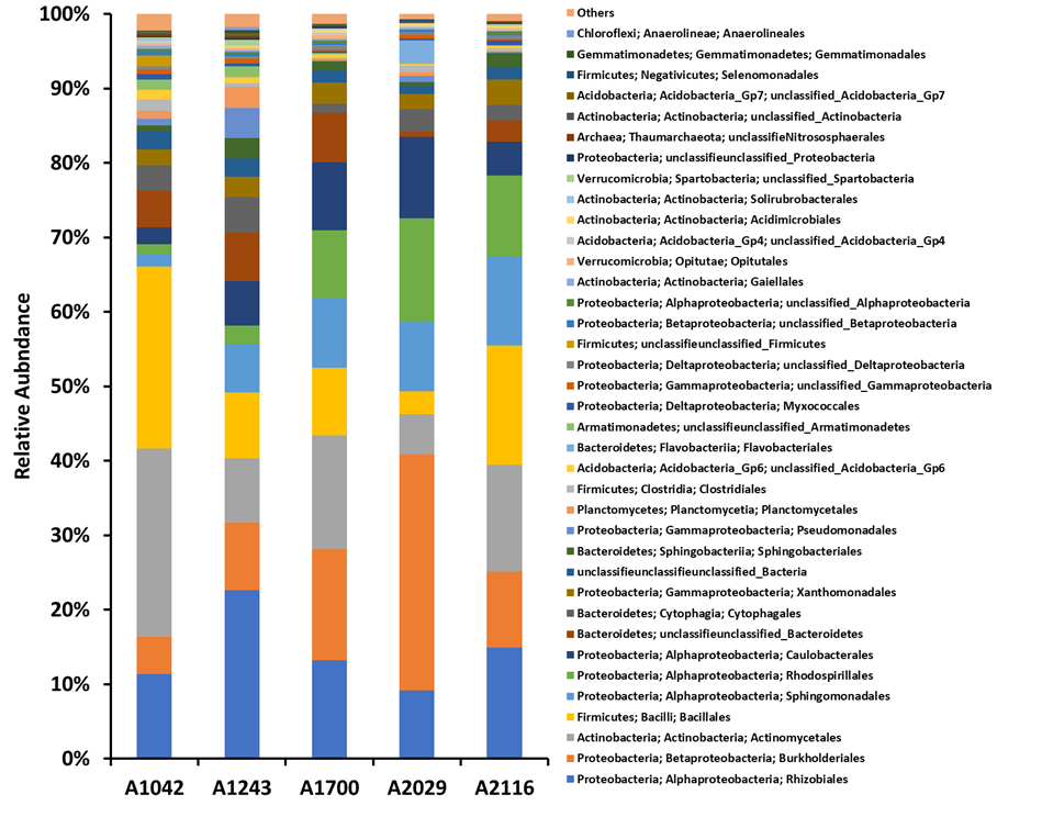 图3. 阿塔卡马沙漠超干旱梯度5个地点的土壤优势细菌的相对丰度