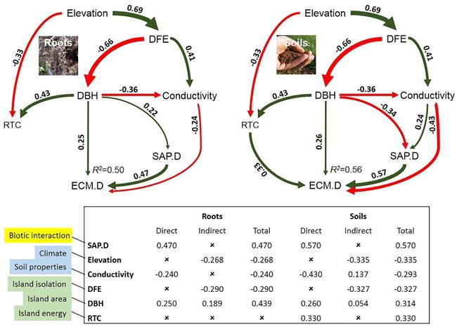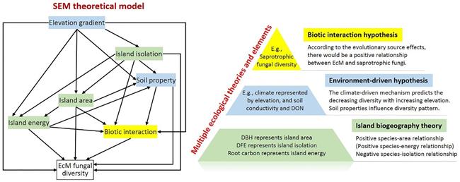 借助于整合模型的思路框架(结构方程模型)以及多模型的比较(最小二乘多元回归模型、偏最小二乘回归模型、方差拆解模型),发现岛屿生物地理学理论的各要素对外生菌根真菌多样性均有重要影响:外生菌根真菌多样性随树木胸径增加而增加,随离森林边界距离增加而减少,并随细根碳含量(表征岛屿能量)增加而增加。此外,在整合模型中,腐生真菌多样性对外生菌根真菌多样性有着极强的直接促进效应。以上结果验证了岛屿生物地理学理论能够很好地解释土壤功能真菌的分布规律,同时也阐明了腐生真菌与外生菌根真菌多样性间的正向耦合关系,暗示了外生菌根真菌源起腐生真菌的独立进化事件。