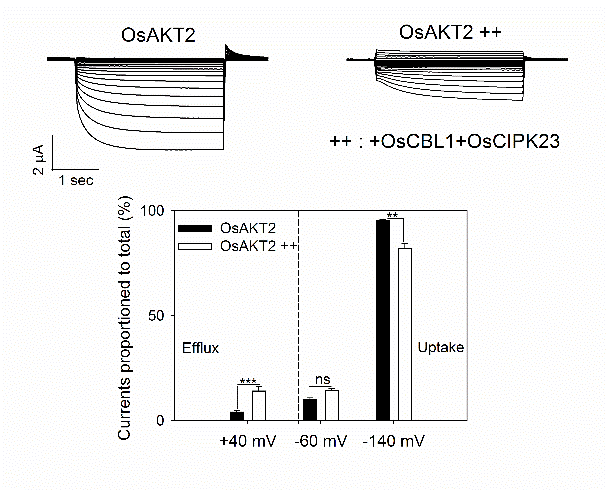 图2. OsAKT2的K+外排活性可被OsCBL1/OsCIPK23磷酸化机制部分解锁