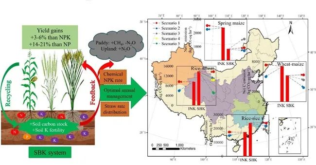 针对以上科学问题,我室王火焰研究员团队构建了我国有机无机钾资源作物与土壤数据库,结合秸秆循环经验模型与生命周期评价,探明了不同钾管理系统的环境代价与减排潜力。研究结果表明,通过GIS地理信息系统分析,我国整体土壤交换性钾从1980年的100mg/kg提高到2020年的115mg/kg,土壤低钾率(< 100 mg/kg)相应从61%降低到52%,我国南方土壤的钾素肥力提升较为明显。长期不施矿物钾与秸秆移除系统(NP),相比无机钾肥管理系统,玉米、小麦与水稻籽粒产量分别降低9.4%,14.9%和13.4%;基于秸秆循环的钾素管理系统,三种作物产量分别增加5.2%,6.2%和3.0%,以上钾肥肥效反应,在我国南方区域表现更加明显。基于秸秆循环的综合钾管理系统在旱田作物上,净碳排放低于无机钾素管理系统,而在稻田上趋势相反。通过优化周年的化学肥料与秸秆运筹,我国北方春玉米、华北小麦-玉米、长三角小麦-水稻、华南稻-稻轮作系统的碳减排潜力分别可达16.9%, 46.4%, 6论文链接:1,22.9%与22.4%。该研究结果明确了我国不同钾素管理系统的农学生产力与环境代价,对于指导我国构建可持续钾素管理体系提供了科学指导与技术支撑。