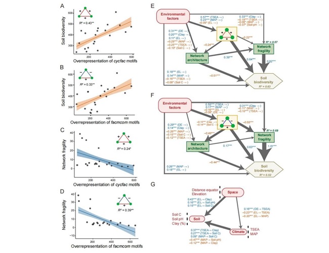 土壤生物是陆地生态系统功能的基本驱动力,介导土壤碳固存、养分循环和有机物降解等关键过程。土壤中的生物并非独立存在,它们构建了复杂的生物共存网络,通过维持新陈代谢途径来促进陆地生态系统的复杂功能。尽管对土壤生物网络的研究越来越多,但土壤生物网络关系如何影响土壤生物多样性的维持仍存在极大地未知。