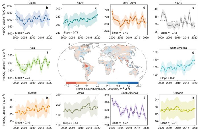 针对这一问题,我室丁维新研究员团队基于全球原位观测数据,绘制了湿地水位时空分布图,结合环境因子数据库和机器学习方法评估了全球湿地碳汇的时空变异特征。研究发现,2000‒2020年全球湿地的平均固碳速率达到1004 Tg C year–1,其中70%来自热带湿地。2005年以前,全球湿地碳汇呈下降趋势,此后则逐步回升。过去20年,北半球中高纬度湿地碳汇持续增加,相反热带和南半球中高纬度湿地则呈下降趋势,总体上全球湿地生态系统碳汇能力维持相对稳定。不同区域湿地碳汇的差异主要受水文要素驱动,在全球气候变化背景下,日益加剧的水文极端事件将削弱湿地碳汇的韧性及其所支撑的生态系统服务功能。