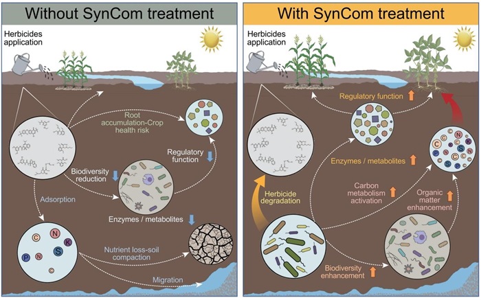 土壤与农业可持续发展全国重点实验室褚海燕团队通过采集辽宁铁岭至黑龙江黑河的东北典型黑土区的52个代表性土壤样品,检测了土壤中8种典型除草剂的残留水平。通过高通量测序和高通量纯培养技术筛选到9株能够高效降解复合除草剂的菌株,并构建了一个由4个菌株组成的合成菌群(SynCom),能降解多种复合除草剂、稳定定殖在土壤中、增加土壤细菌多样性并显著增强土壤酶活水平。