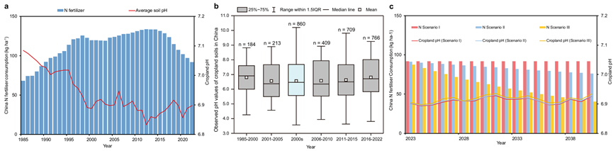 土壤酸化是全球农业面临的重大环境挑战之一,严重制约了作物产量和生态系统服务功能。正如张福锁院士团队2010年在《Science》发表的研究发现,自20世纪80年代以来,受高强度氮肥投入等因素影响,中国农田土壤经历了显著的酸化过程。然而,农田土壤酸化的精细时空演变特征、近期趋势及其对农业管理措施的响应尚不明确,主要原因是缺乏长时序的观测数据支持,这不但限制了对土壤健康状况的精准评估,也制约了国家粮食安全战略下农业可持续发展政策的制定。