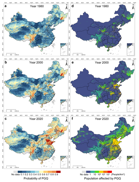 针对这一问题,我室尧一骏研究员团队基于搜集的近两千篇历史调查文献数据,结合自然环境和社会经济等多源因子,利用机器学习模型重建并预测了1980年至2100年中国地下水劣五类水质(Poor Groundwater Quality, PGQ)概率的逐年时空分布图谱。研究发现,1980年至2020年间,中国地下水水质呈现明显的恶化趋势,劣五类水质区域比例从1980年的17.3%攀升至2000年的30.1%,并进一步增至2020年的40.8%;受影响的人口比例也相应由6.8%激增至36.0%。研究定量解析了驱动水质变化的因素,指出农业排放是导致地下水水质恶化的首要因素(贡献了10.7%的面积比例增长),其次是地下水开采(5.6%)和工业排放(5.3%)。未来情景模拟显示,到2050年,在不同的社会经济发展路径和气候情景下,中国劣五类水质区域比例预计将在37.9%至48.3%之间波动。研究结果凸显了采取积极有效的水资源管理和保护措施的紧迫性,以遏制地下水水质恶化趋势,保障国家水安全。